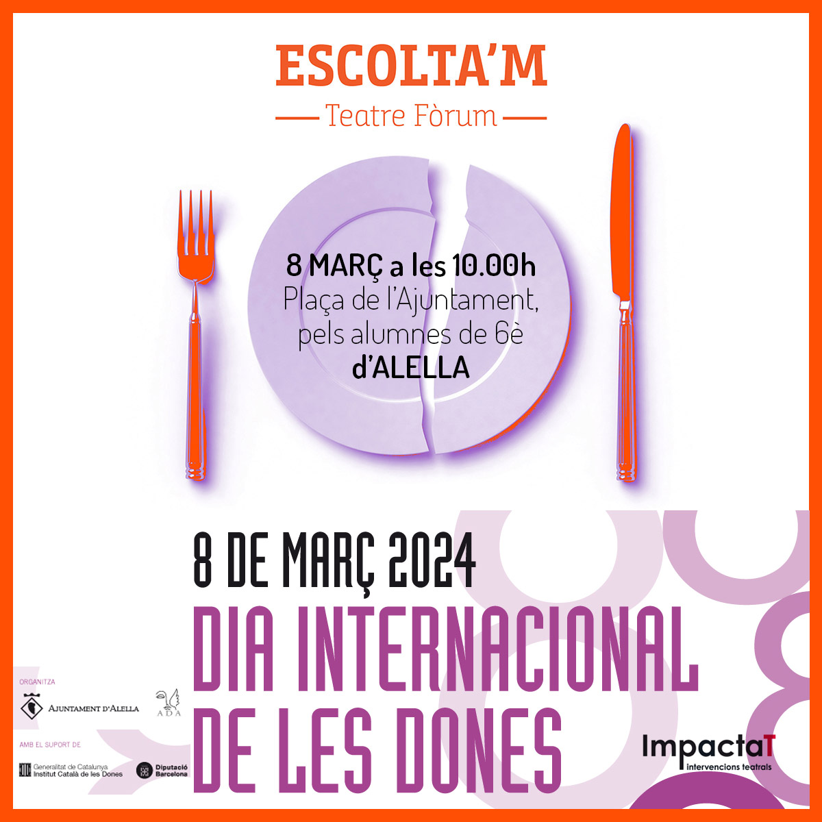 Dins els actes del Dia de la Dona d’Alella, ImpactaT farà pels alumnes de sisè, ESCOLTA’M..! Teatre fòrum sobre coeducació i relacions igualitàries en l’àmbit familiar.